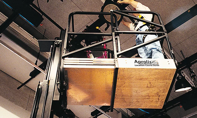 Un poste de secours est présent sur le châssis. L’énergie est fournie par une batterie de traction. Grâce à ses dimensions compactes, la nacelle à mât vertical se faufile entre les chaînes de montage, les rayonnages, les canalisations et les cloisonnages en contournant tous les obstacles.