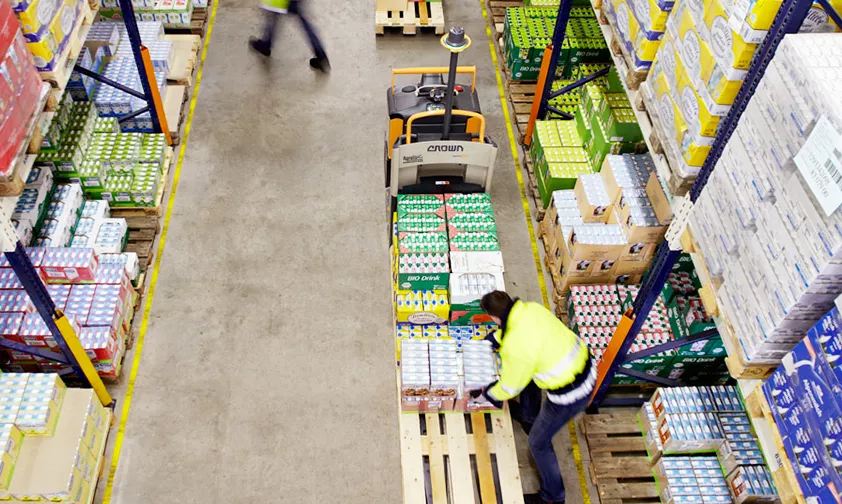 L’opérateur conduit les préparateurs de commande avec les fourches dans le dos. A l’aide de son préparateur de commande, il peut prélever différents articles ou colis de faibles poids manipulables à la main afin de rassembler tous les éléments de sa commande.